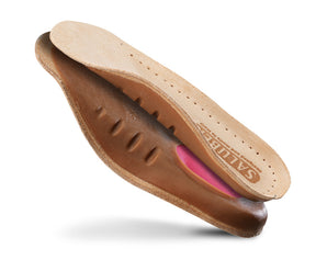 Unter der Ferse befindet sich ein stoßdämpfendes Polster, das die Aufprallkräfte bei jedem Schritt abfängt und Fersenschmerzen vorbeugt. Die Lederoberfläche bietet eine hygienische und rutschfeste Fläche, die auch bei täglichem Gebrauch langanhaltend bequem bleibt.